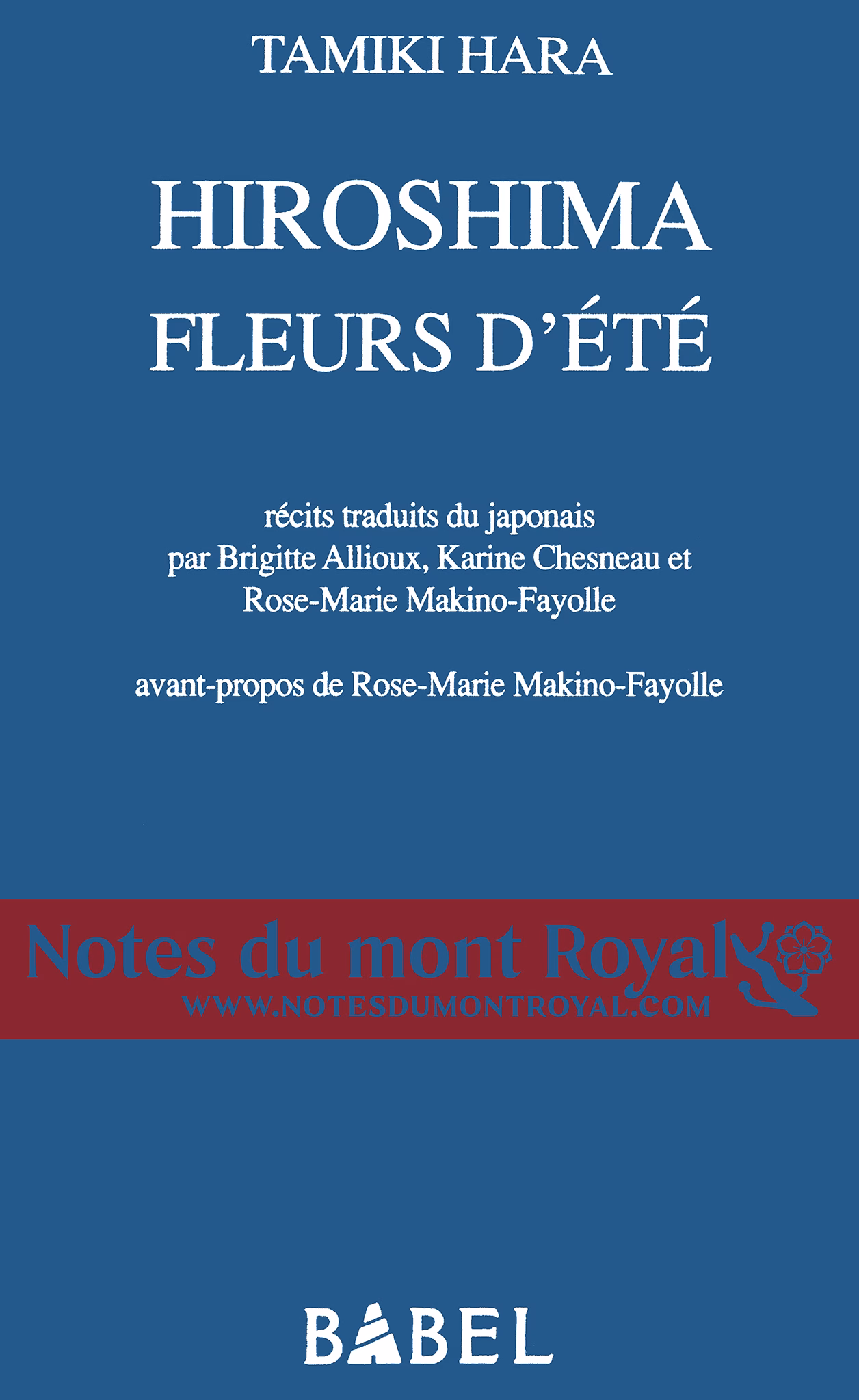 Hara, Tamiki, Hiroshima : fleurs d’été : récits (Hiroshima: Summer Flowers: Stories), trans. from Japanese by Brigitte Allioux, Karine Chesneau and Rose-Marie Makino-Fayolle, Arles: Actes Sud, coll. “Babel”, 2007.